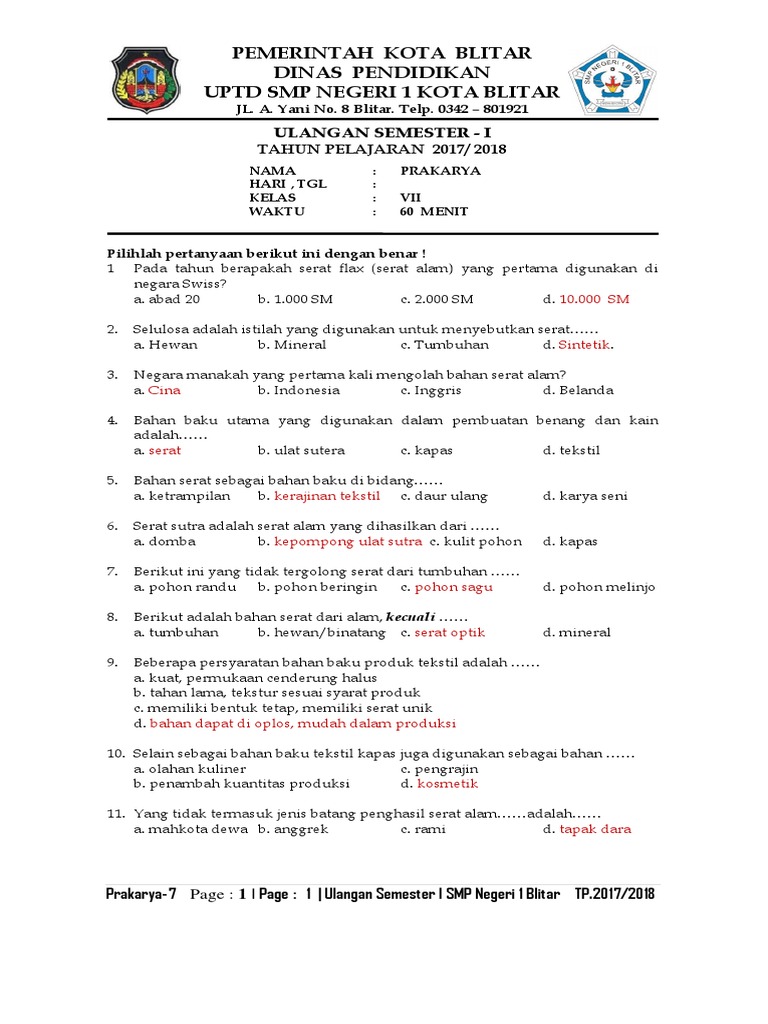 Soal Kunci Jawaban Latihan Uts Pts Kelas 7 Smp Pelajaran Prakarya Kerajinan Bahan Serat Alam Halaman All Tribunnewsmaker Com