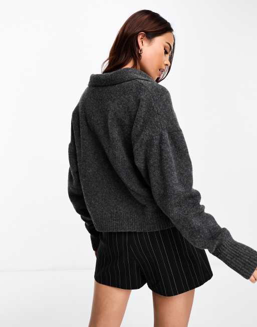 Monki Long Sleeve Collar Knitted Sweater In Dark Grey Asos